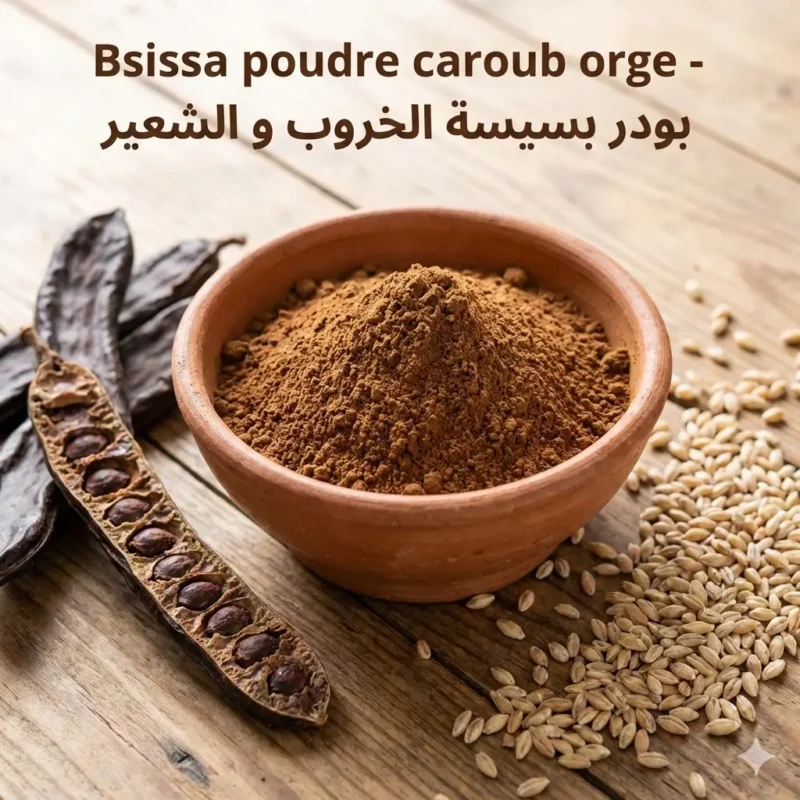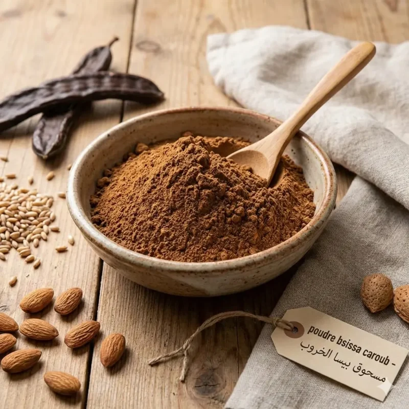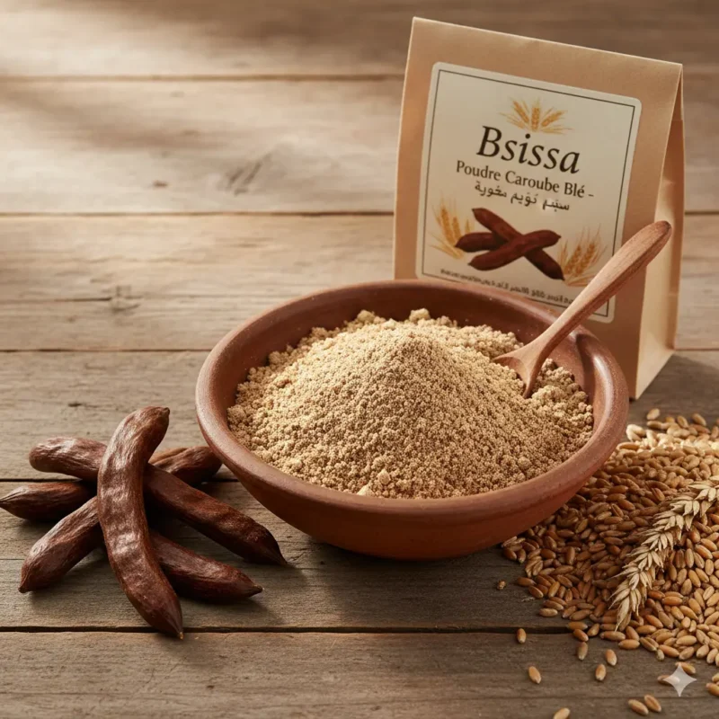 Poudre Bsissa Caroube & Blé Tunisie Savory Un mélange authentique de caroube et de blé finement moulus, au goût naturellement